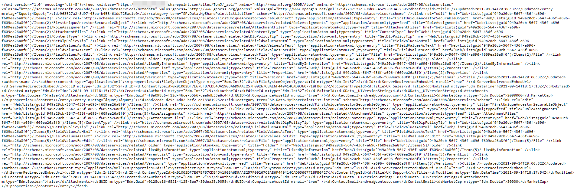 https://<MyDomain>.sharepoint.com/sites/TomJ/_api/web/lists(guid'949a20cb-5647-436f-a696-f609ea26a8f0')/items?$filter=ContactEmail%20eq%20%27Andrea@contoso.com%27