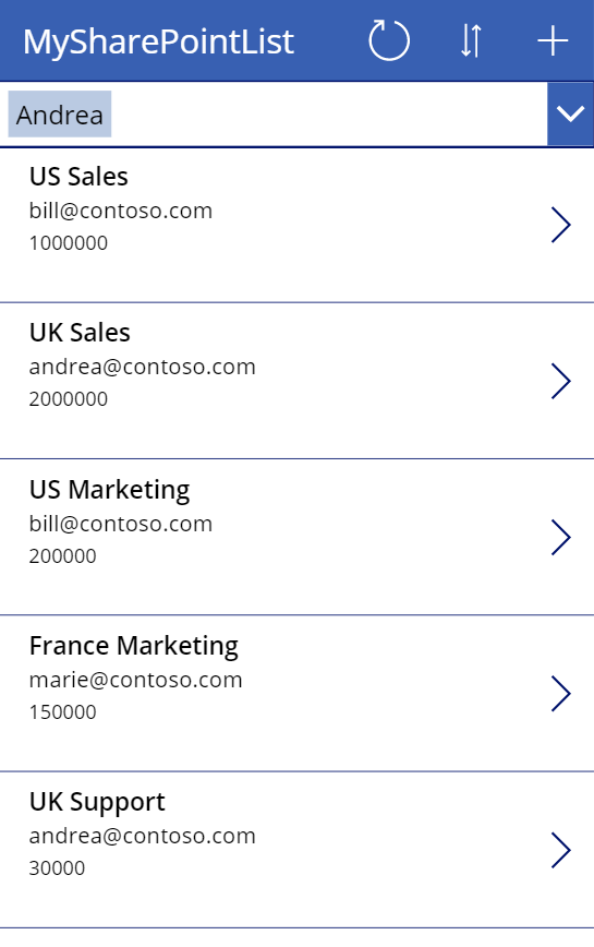 https://<MyDomain>.sharepoint.com/sites/TomJ/tables/949a20cb-5647-436f-a696-f609ea26a8f0/items?$filter=ContactEmail eq 'Andrea.R@contoso.com'&$top=100
