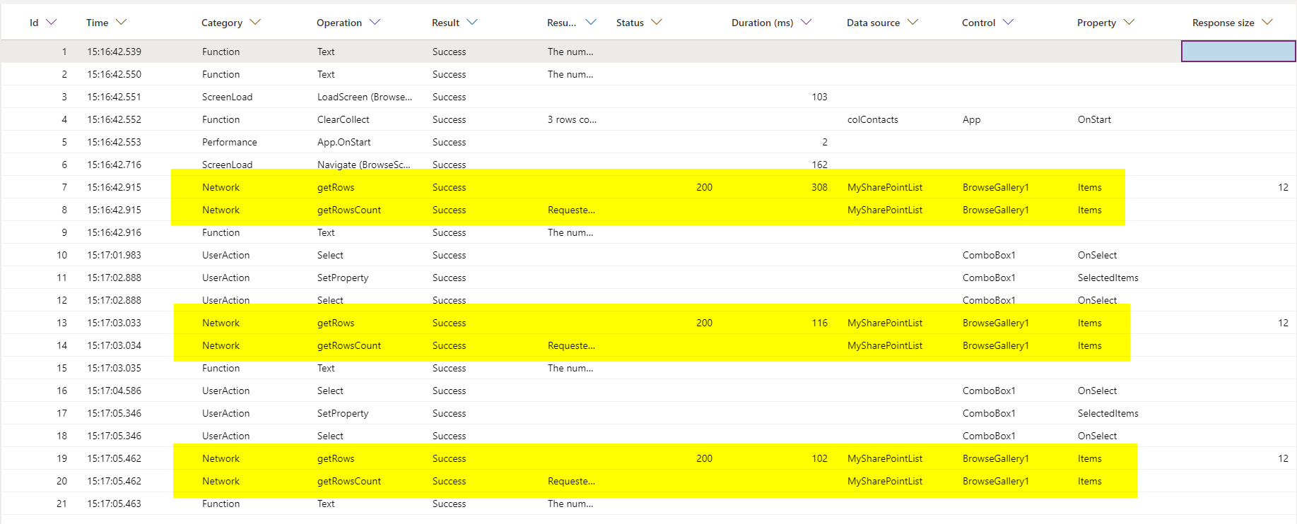 Once we have that captured, look for rows in the Monitor trace where the Control column matches our gallery’s name, and the Property column says “Items”. In my case, that would be the rows highlighted: