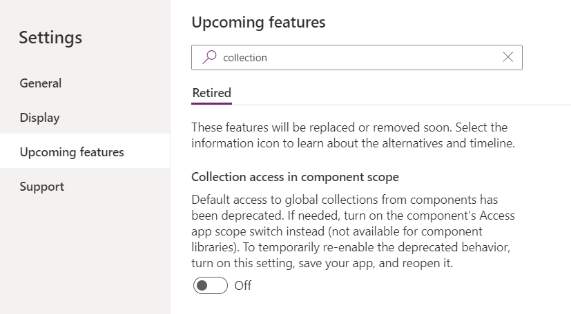 Note: This setting works properly for new apps but not existing ones. Existing apps will be supported with a bug fix in Studio version 3.21083. As a workaround, you can turn off the “Collection access in component scope” “Retired” feature under “Upcoming features” in the app’s Settings, save the app, and then reopen.