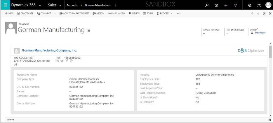 Customers who are using Dynamics 365 will benefit from a D&B Optimizer solution available for Dynamics 365 for Sales which brings the Business Profile information directly back into the Account form.