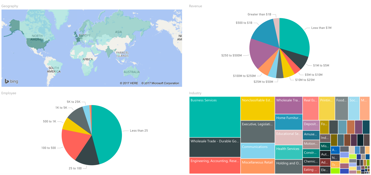 The enriched Business Profile not only includes the business and contact information for an organization, but also the information to support data cleansing and improvement, territory management and organizational structure. With access to this business intelligence, organizations will gain a single source of data truth to increase alignment across your organization and improve productivity with a more complete view of your customers and prospects. The D&B Optimizer solution also includes PowerBI reports to segment your customer data, and quickly identify data quality issues.