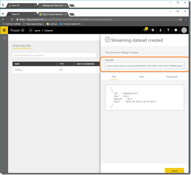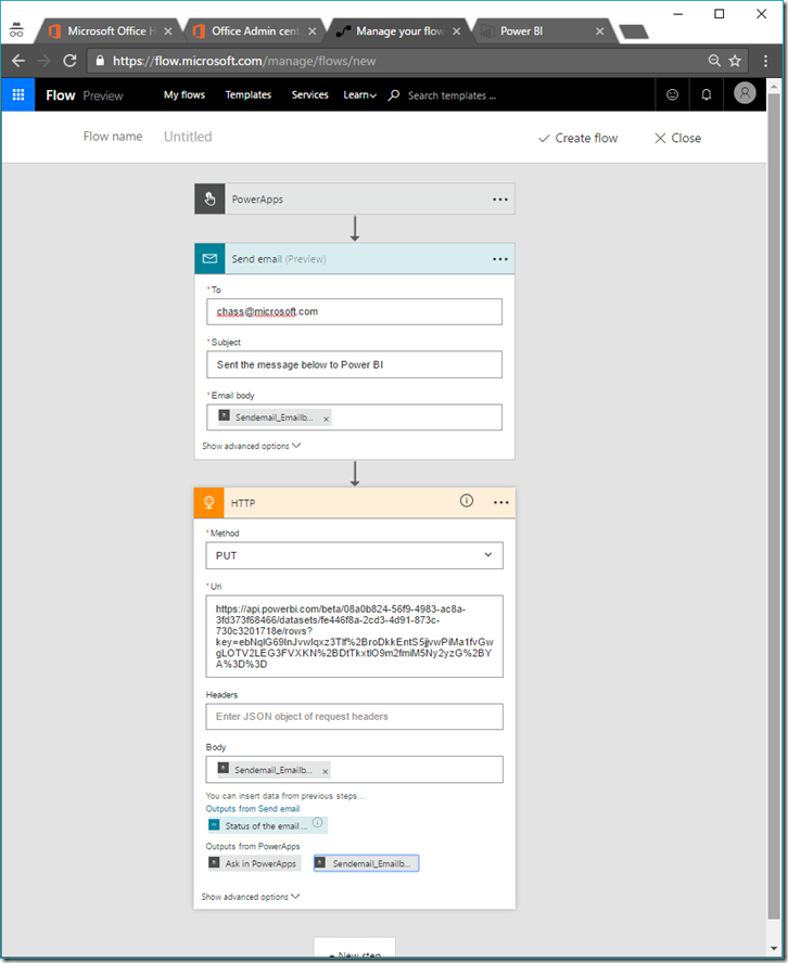 From Step 6 copy the URL Power BI supplied for pushing in the JSON. For the HTTP body select the email body supplied at the bottom of the HTTP action card.