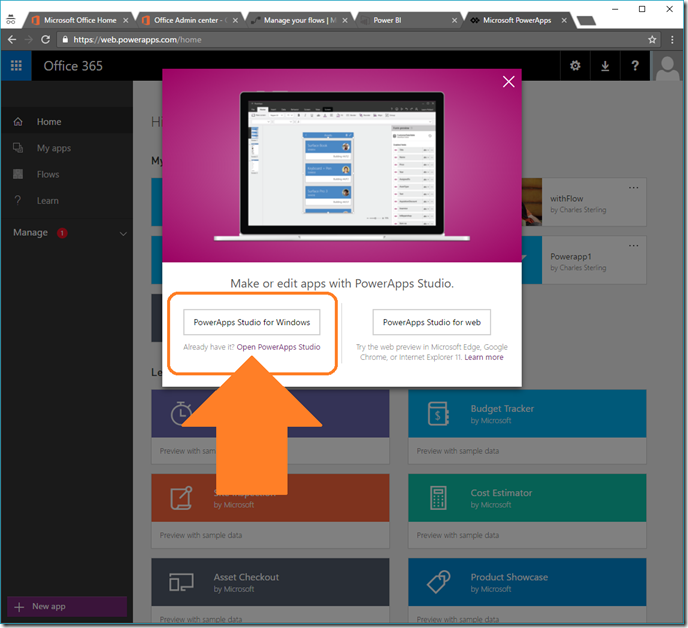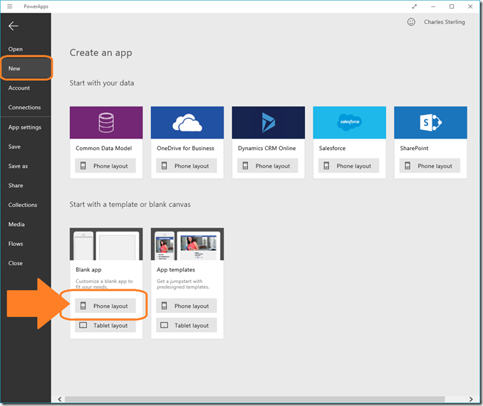 After you log into PowerApps you you can choose to get started with a sample App or start with a brand new application.