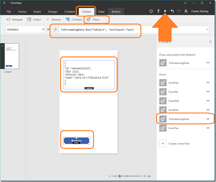 After selecting the button select “Action” > “Flows” and you will see all the flows that have been created to be activated by PowerApps.