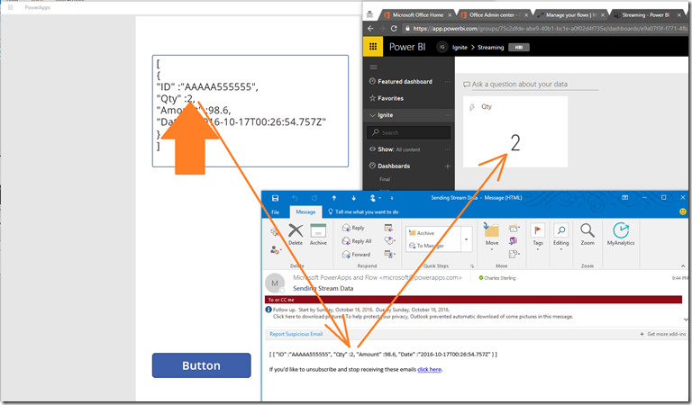 Pressing the button you should immediately get a piece of email with the JSON being sent to Power BI and the real time tile being updated.