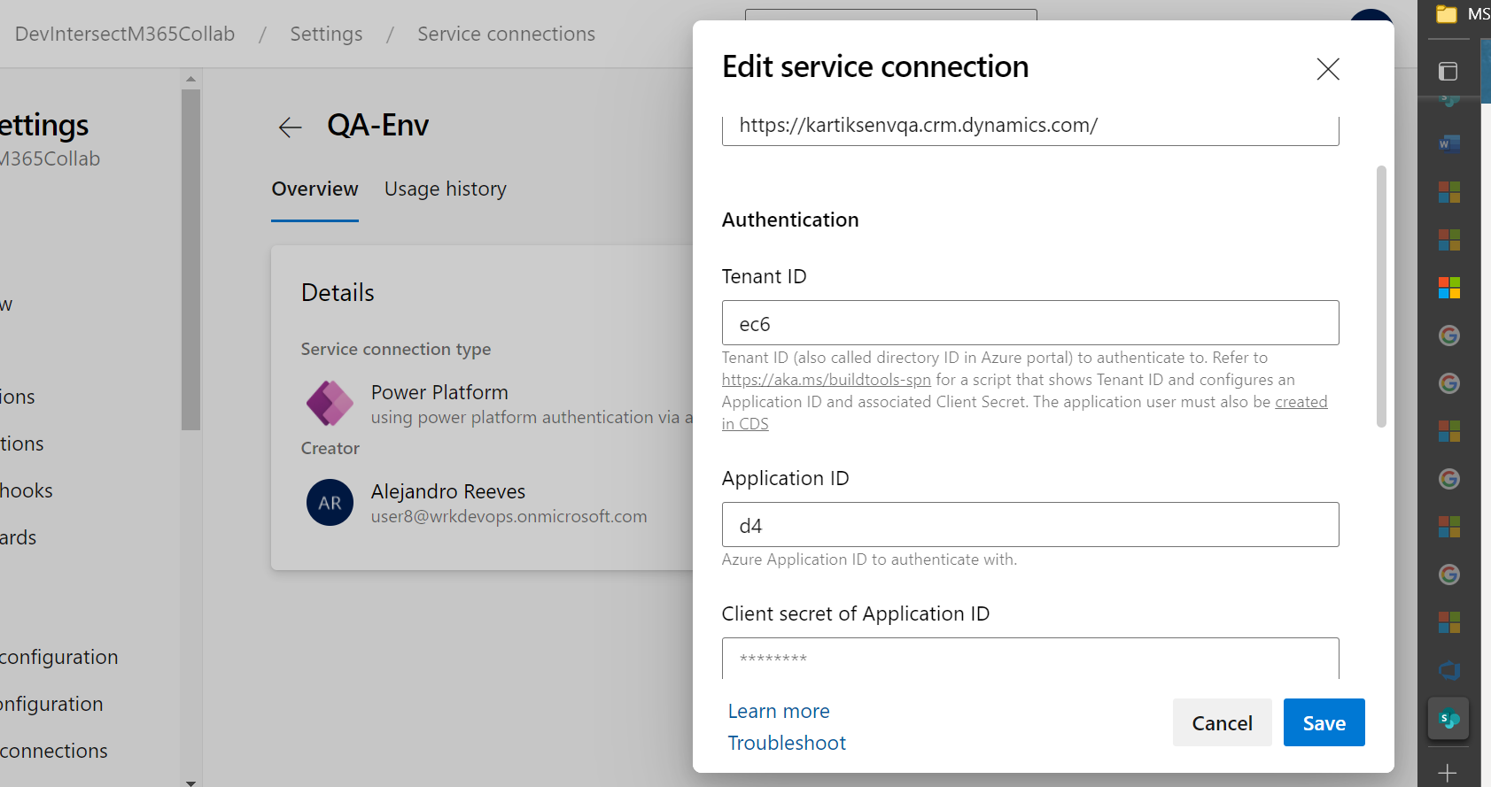 Figure 12: Changed Key Vault values for the Target QA environment