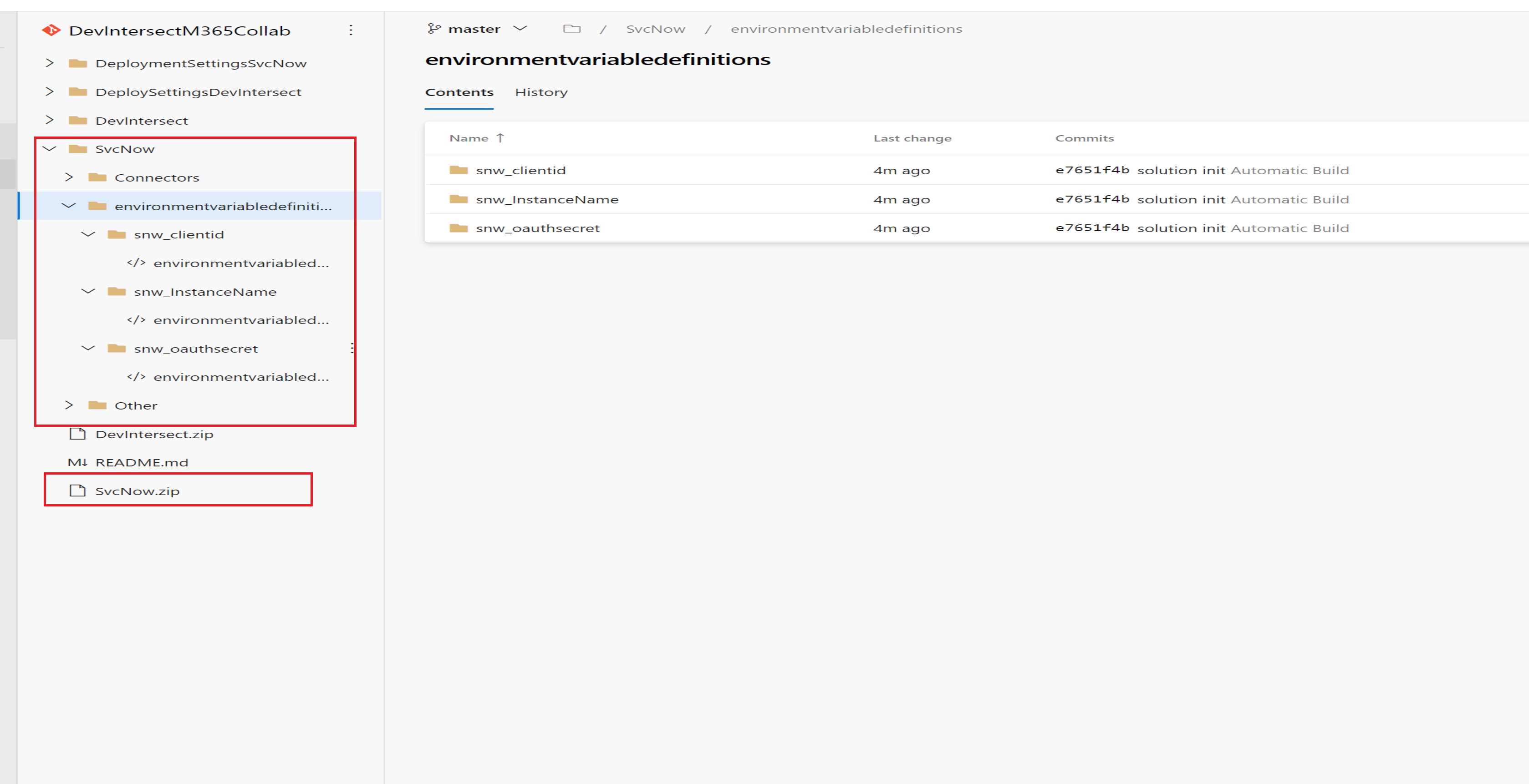 Both the SvcNow.zip (solution zip file) and the unpacked solution file are now in the repository. For secrets, we recommend that you do not create default values with the location of your secrets and only store them as current value.
