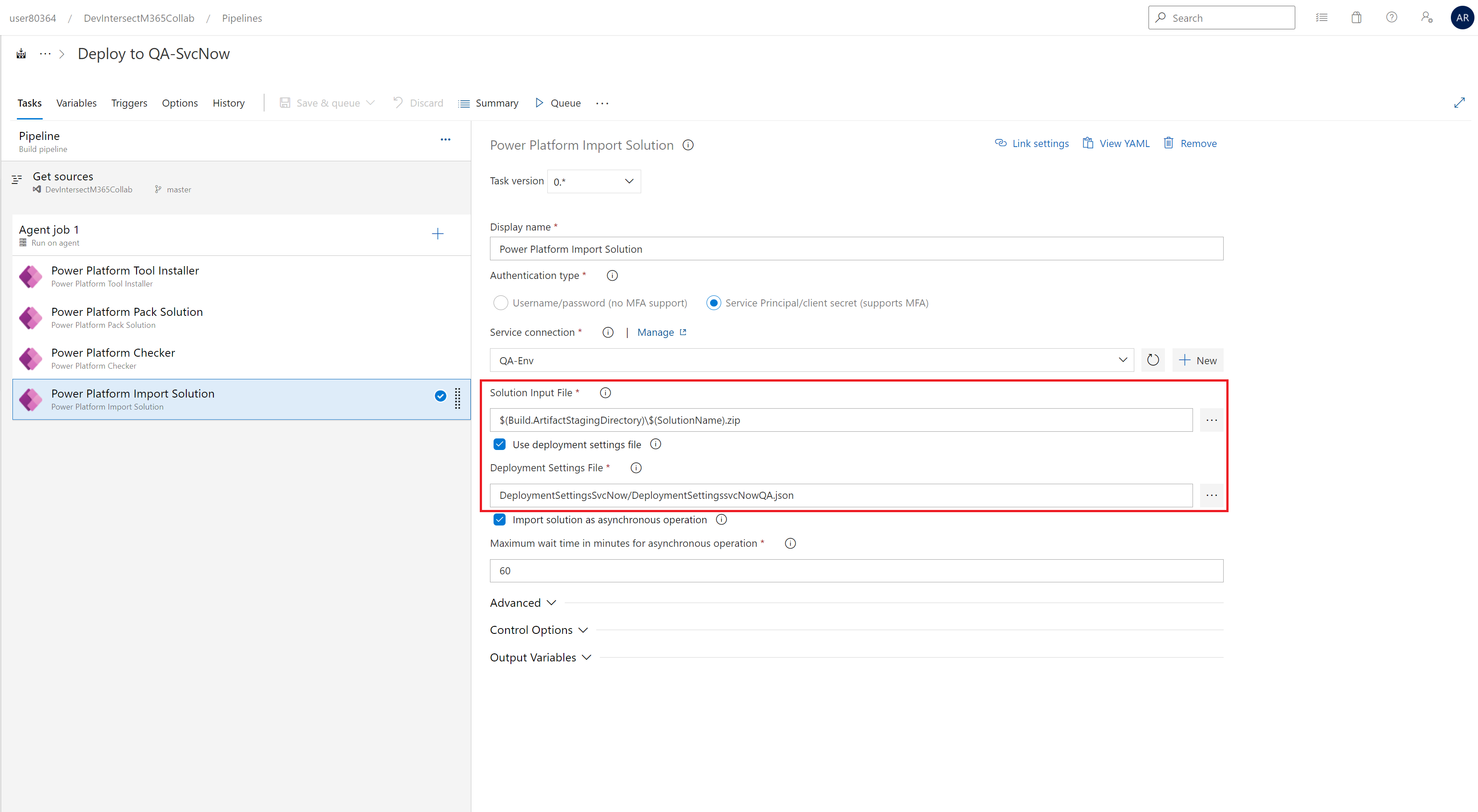 Make sure that you have selected the “Use deployment settings file”, this is a key operation to make this pipeline work with Azure Key Vault for the target environment.