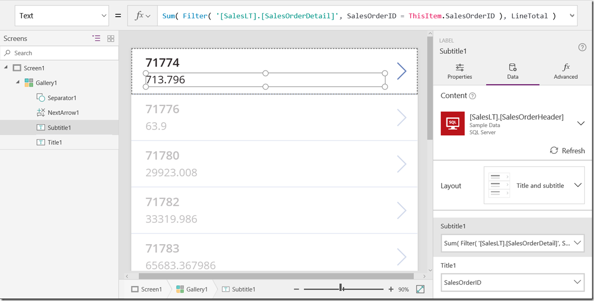 This next part is new. For the Subtitle1 field of the Gallery, we will use a combination of the Filter and Sum functions. The filter will limit our summation to just the detail records for this order, by matching the foreign key of SalesOrderDetail (SalesOrderID in the formula, part of the filter’s record context) with the primary key of SalesOrder (ThisItem.SalesOrderID in the formula). The filtered result is then added up and the result shown in our gallery: