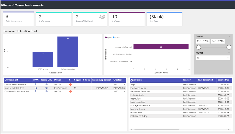 A Power BI dashboard, which is already part of the CoE Starter Kit has been updated with dedicated Dataverse for Teams views. These views give admins visibility into how their organization is using Dataverse for Teams, and can further identify highly used as well as inactive environments.