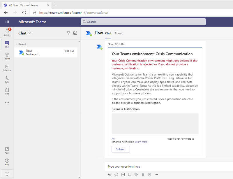 You can leverage our philosophy of using Microsoft Power Platform to manage Microsoft Power Platform by building automation to send welcome emails to owners of new Dataverse for Teams environments and requesting business justification for the newly created environments. Central IT can then effectively engage with new makers and ensure that Dataverse for Teams capacity is used effectively in the tenant and distributed to the most valuable business use cases. Similar workflows can be used to apply specific DLP policies to Dataverse for Teams environments as needed and to invoke clean-up of unused assets that can be repurposed for more compelling scenarios in the tenant.