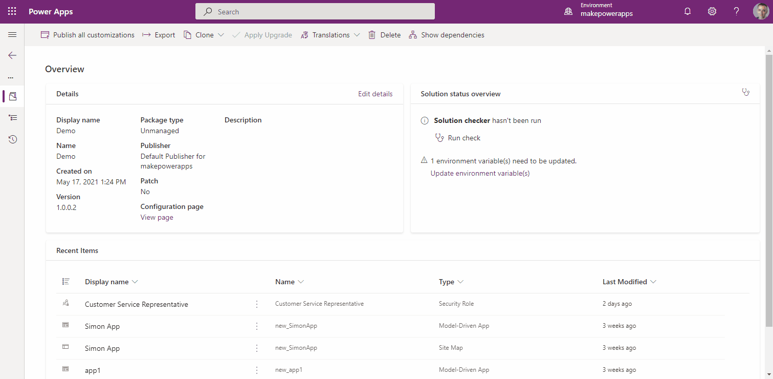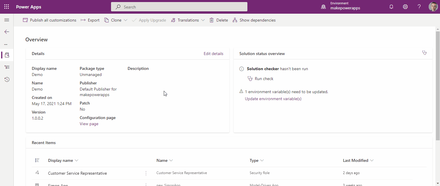 This overview page gives you all the commands needed to manage the solution, such as Import/Export, Cloning, Publishing, as well as cards that help you manage the solution properties, solution health and a list of the recently updated objects in your solution.