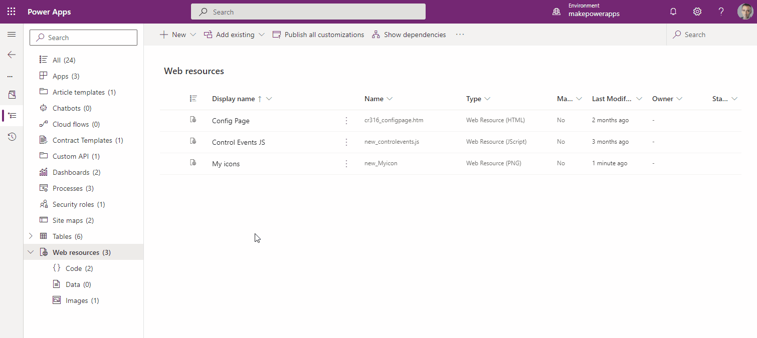 Another set of objects that can now be created and updated on the maker portal are web resources. You can also quickly access like types by expanding Web resources item in the tree view to pick from Code, Data, or Images.