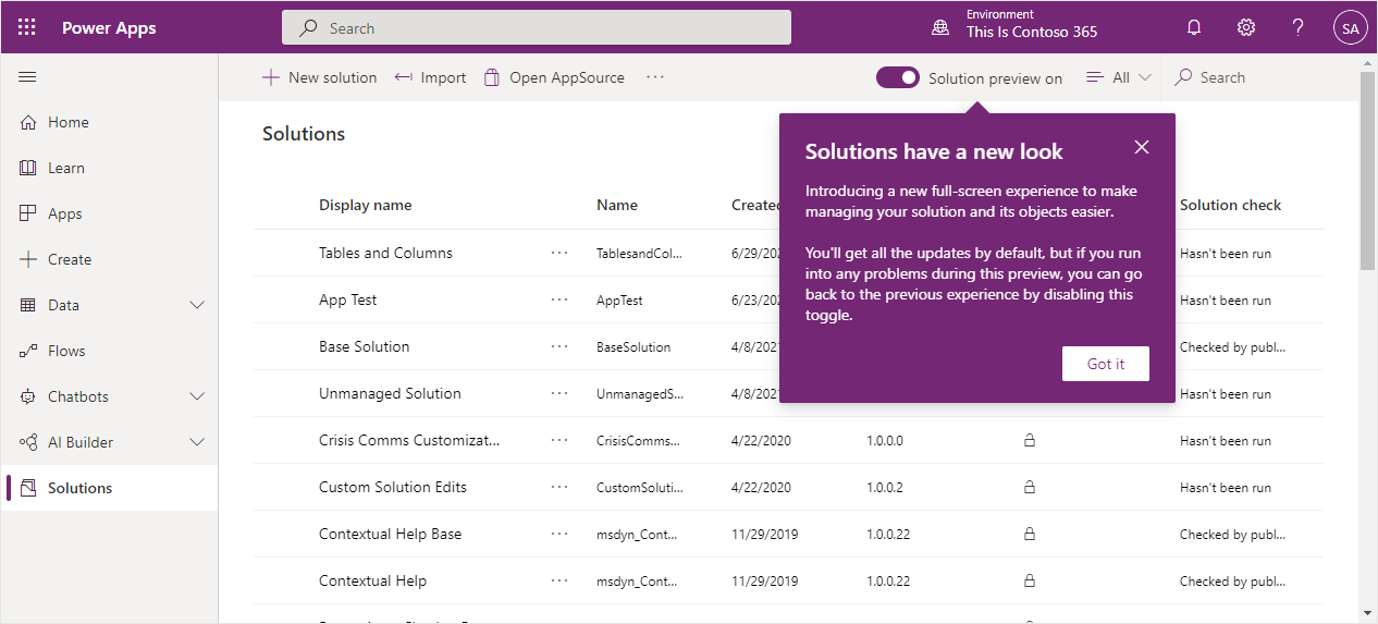 This experience will soon become the default experience on the maker portal, but whilst we’re in preview if you run into any issues, you can disable the preview experience by toggling the switch on the solution list.