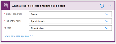 For this example screenshot below, we are using the Dataverse / Common Data Service (current environment) connector with the When a record is created, updated or deleted trigger so that we can notify the relevant user when a new record has been created.