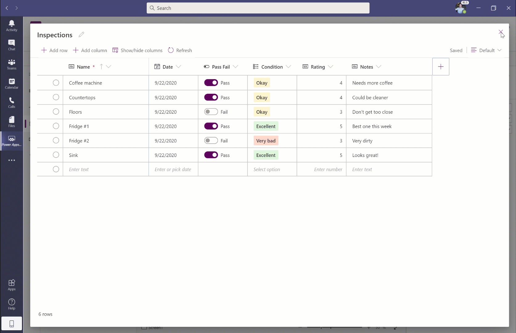 To build your first table, just select Create table on the left hand side of Power Apps. Add columns with specific types — text, numbers, dates, etc. — which will help with app building later. You can even create choice columns with a predefined list of options, and lookups that establish relationships to other tables. For example, you can use multiple tables to track Tasks associated with an Inspection which is in turn related to an Area and covered by a Team. As you’re designing your tables and columns, you can also start filling in rows of data in real time, just like you would in Excel.