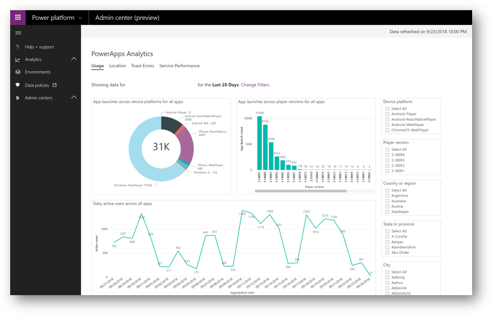 New rich insights for admins. The Power platform admin center is in now in Public Preview. In the first phase of this preview, admins will be able to access new usage, error and performance reports for the apps and flows that users have built within their organization. Over time, the Power platform admin center will become the one-stop shop for adminstering PowerApps, Flow, and Dynamics 365 across an organization as well as an improved front door for support.