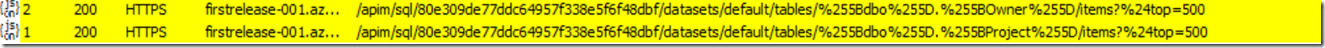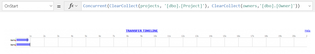 When the app is loaded, 34 calls were made through the SQL connector and took 6.582 seconds to complete (broadband connection). Taking a closer look at the timeline as seen in a fiddler network trace, we see that a call to fetch the Project table , then each visible gallery item (and few more) triggered a call to the owner database to fetch owner information for that item.