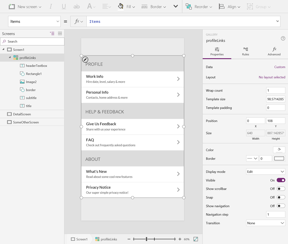 As you can see, the number of controls needed is much less. Updating the UI becomes easier as changing the gallery template is reflected in all items. The data itself can be dynamically fetched from an external source like SharePoint or CDS.