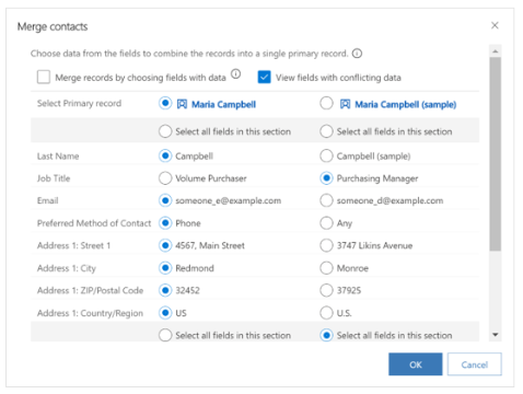Duplicate records can happen in your data when users create or edit records manually or import data in bulk. You can easily merge data and retain the record you want and choose up to two records to merge from the view or list page.  Merge the data into a single record with the new Unified Interface merge record dialog experience.