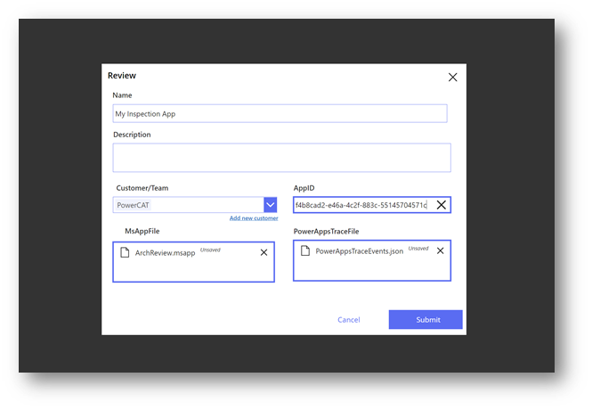 Simply add the app name, msapp file and other optional fields. Including a Power Apps Monitor trace event files will give addition insight into slow queries within the app under review.