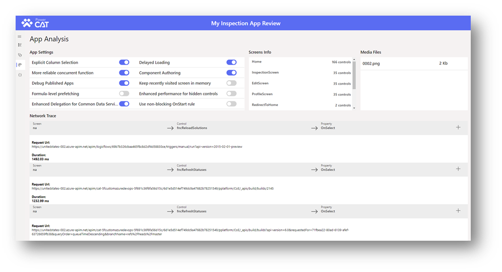 The app analysis section allows us to quickly check if certain important app setting flags are on. The flags have an impact on performance. The screen info section gives us a quick count of the number of controls used for each screen to ensure that it is below the recommended max of 300 control per screen. The media files sections list all medias embedded with the app as well as their size. Finally, the network trace section helps identify slow network requests within the app.