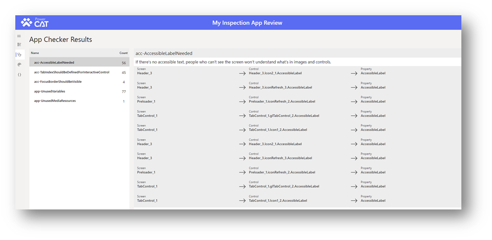 The app checker screen shows the results from the app checker result run for the app when it was last published. These results are available in the Power Apps studio as your build your app but they are included in this tool for convenience. A quick glance at the app checker result will often show serious issues with the app such as inefficient loading or delegation issues.