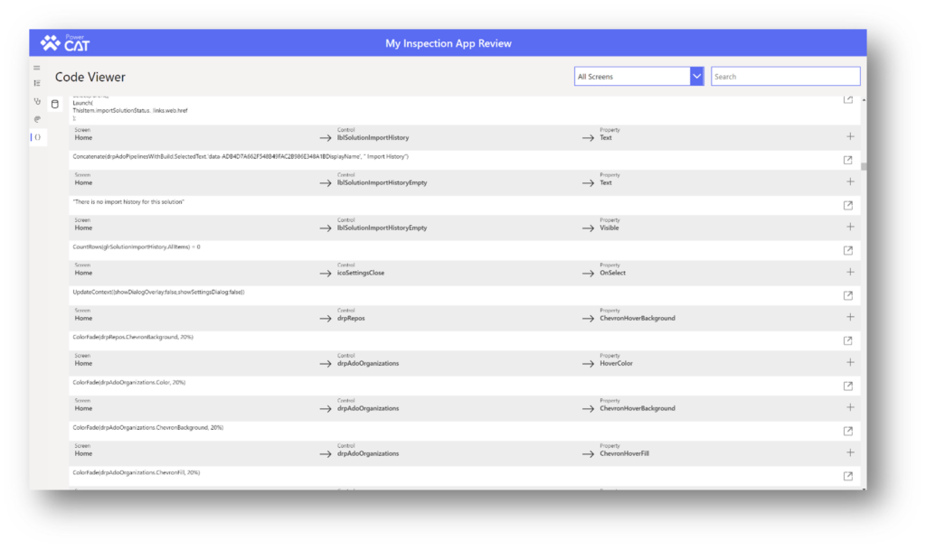 The code viewer section lists all screens, controls and properties with a search and filter function allowing you to quickly find formulas within your app. You can search by control name, property or simply by any text that can be present in power apps formula.