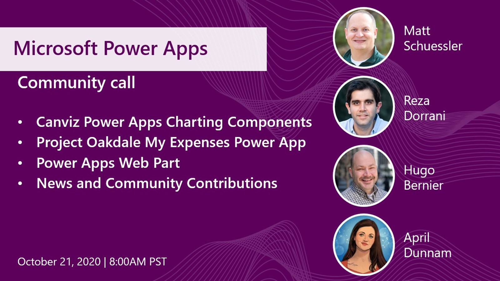 Canviz has been working on Power Apps charting components for much of 2019 and have graciously decided to give them to the community. This component will include nine of the most commonly requested charting visuals (i.e. Scatter, solid gauge, Radar, Candlestick, funnel, and Gannt!). This month’s community call will then proceed with a walk through of a Power Apps Expense Application built with Dataverse (so fully integrated with Microsoft Teams) by Reza Dorrani. The demos will conclude with April Dunnam and Hugo Bernier walking us through an ENHANCED Power Apps SharePoint web part built by our very own community start and MVP Hugo Bernier!
