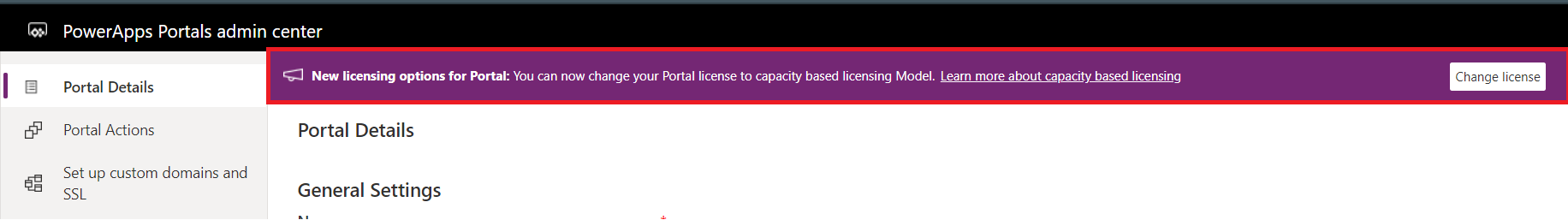 If you’re using capacity-based licensing model, you’ll see “Change License” notification on Portal Details page.