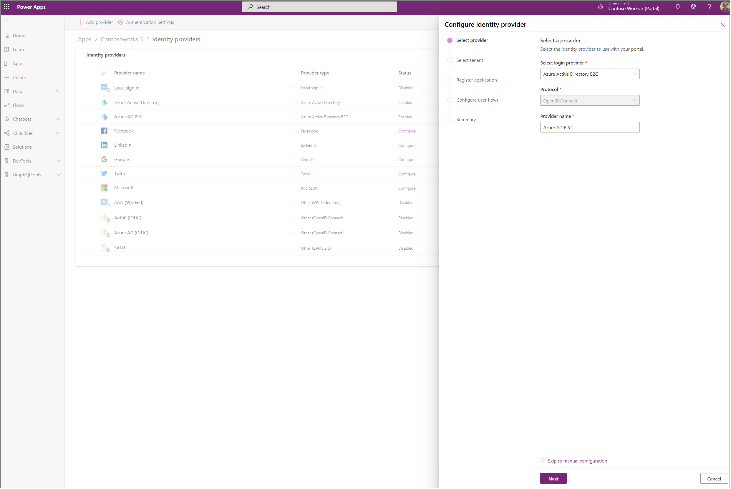 A unique preview experience is available now to setup Azure AD B2C with portals using a wizard for a quick and complete configuration directly from the Power Apps portals authentication settings.