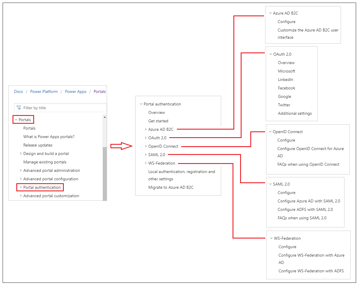 Power Apps portals supports variety of identity providers such as Azure Active Directory, and Azure Active Directory B2C, as well as authentication protocols such as OpenID Connect, OAuth 2.0 (Microsoft, Google, LinkedIn, Twitter, Facebook configured via OAuth 2.0), SAML 2.0 and WS-Federation.