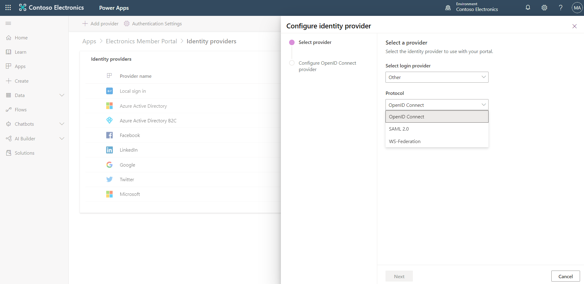 The configuration experience has been in preview since the beginning of 2020 release wave 1, and is now generally available with added support for configuring the identity providers based on the following protocol specifications: