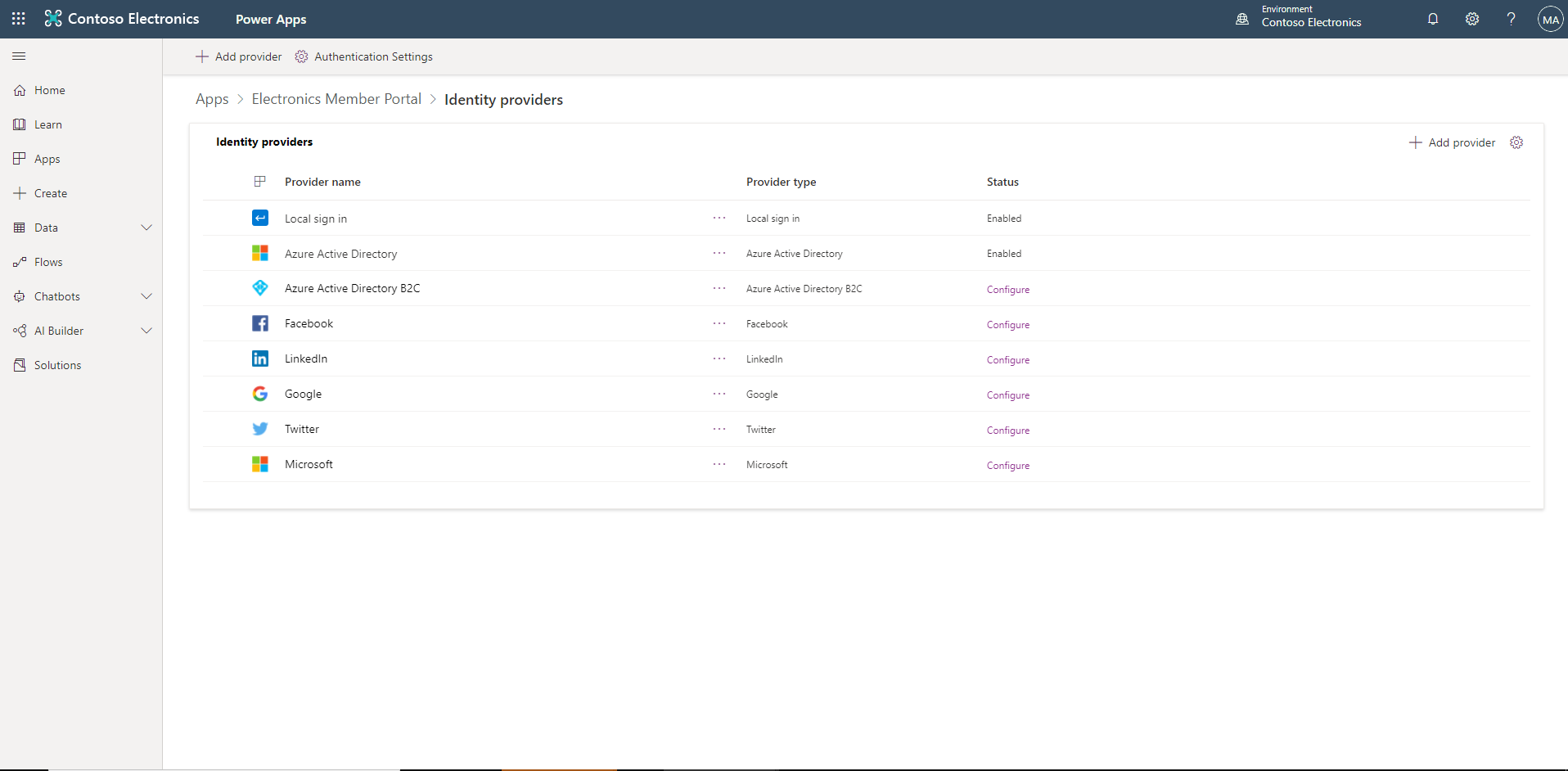 With this feature we are introducing a simplified experience to create and manage authentication settings and identity provider configuration. The experience aims to provide better discovery of supported providers, in-app guidance for makers / administrators to do this quickly and reduce common configuration errors. We have also refreshed portals authentication documentation to support this new experience.