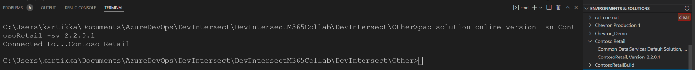 We have also revamped the version capability as well. We have introduced 2 new parameters -rv for revision version or -bv for build version. The version numbering sequence used by Power Platform for solutions is Major.Minor.Build.Revision. You can now use these parameters to increment the build and revision numbers of the solution that you are importing into power platform. The Major and Minor numbers are only incremented when exporting via power platform or if your strategy parameter for version uses Git tags. Here is an example of using pac solution version -rv 6