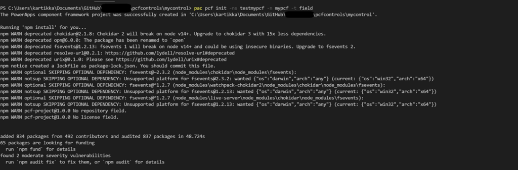 - pac pcf init: now does npm install to get a new PCF project fully initialized. This was a long ask from the PCF development community, to improve this experience, now there is no need to do a separate npm install after initializing a folder for a pcf project.
