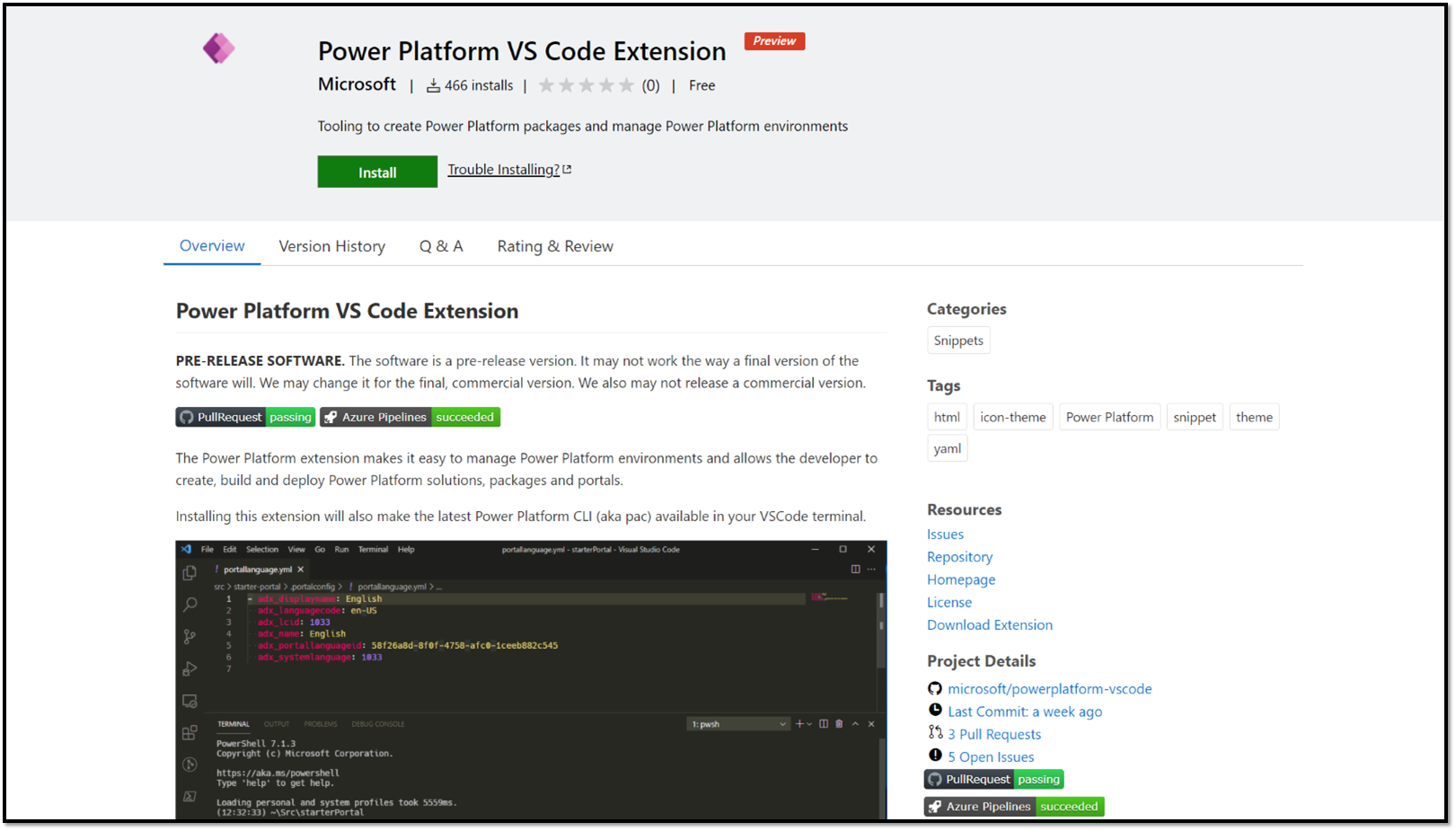 Figure 1: Power Platform Extension for VS Code; VS Code Marketplace page
