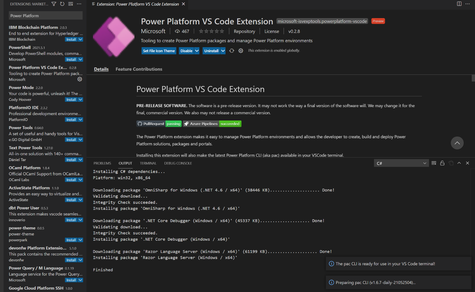 The Power platform extension brings the Power Platform Command line interface (CLI) to work within the context of the VSCode Editing environment, and now code-first developers do not have get out of their developer environment while working with Power Platform artifacts. It is easy install and to start working right away.