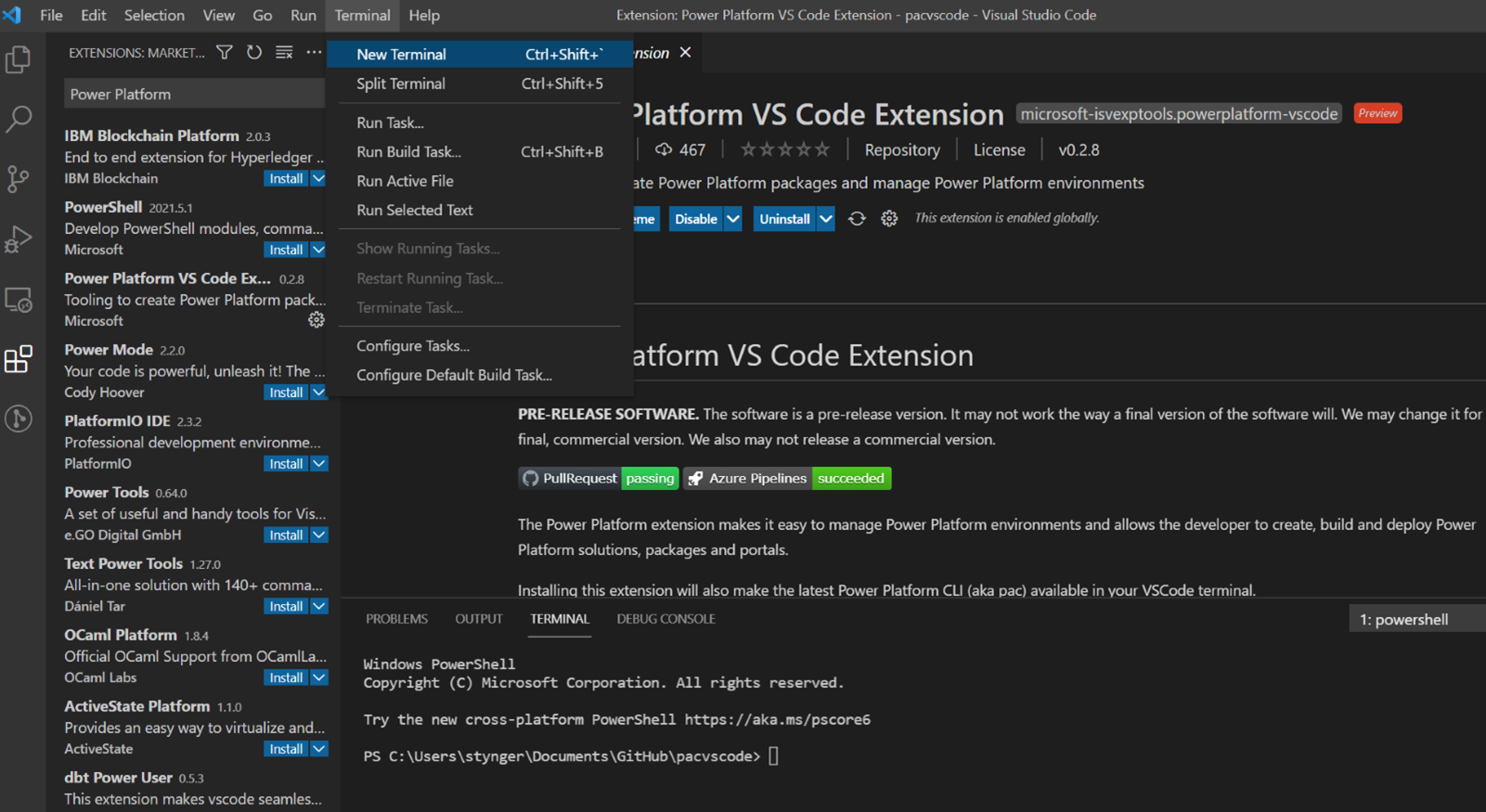 To initiate the Power Platform CLI, go to the terminal window, and select a new terminal and the new extension is up and running