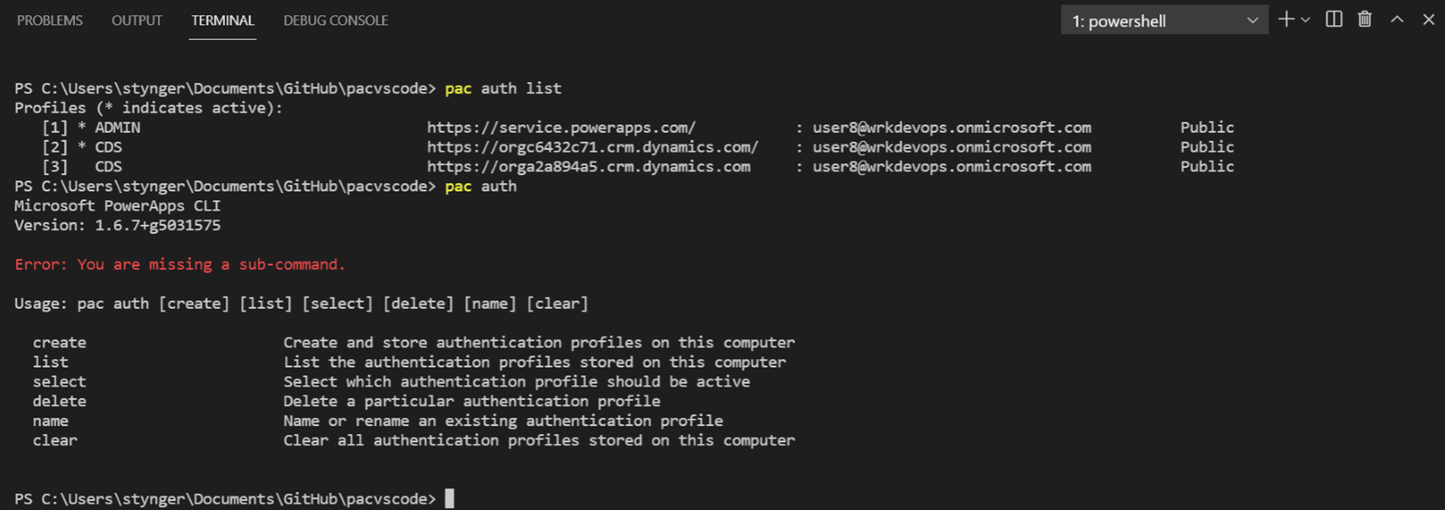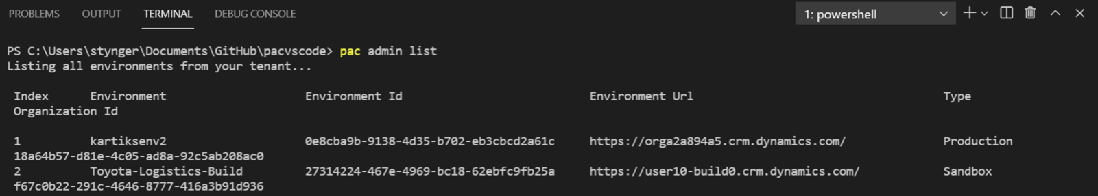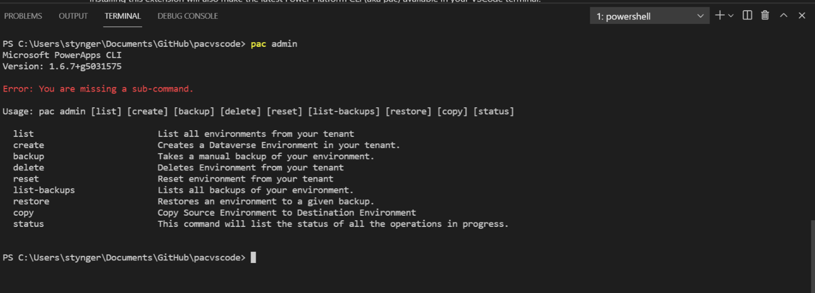 Select install, and once it is installed VS code informs you that the PAC CLI is ready to be used within the Terminal window