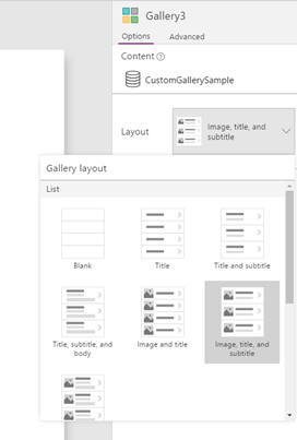 After selecting any of the options above, in the right-hand options panel, you can now select Gallery layout to further customize the experience as can be seen below. Some options include title only, title and subtitle, image and title, etc.