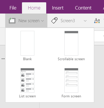 Clicking on New Screen, you will now find four new screen layout options in the dropdown. They are respectively Blank, Scrollable screen, List screen, and Form screen.