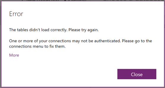 - Always have users check their connections to ensure all passwords are current and the connection can be made to data sources. They may, or may not see, an error message like this one in that case: (see https://powerapps.microsoft.com/en-us/tutorials/add-manage-connections/ )