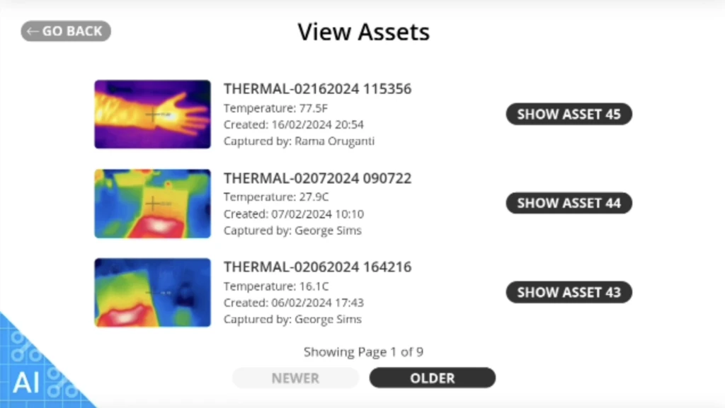 View of the “View Assets” screen in the RealWear application built with Power Apps. This view includes the used thermal camera view.