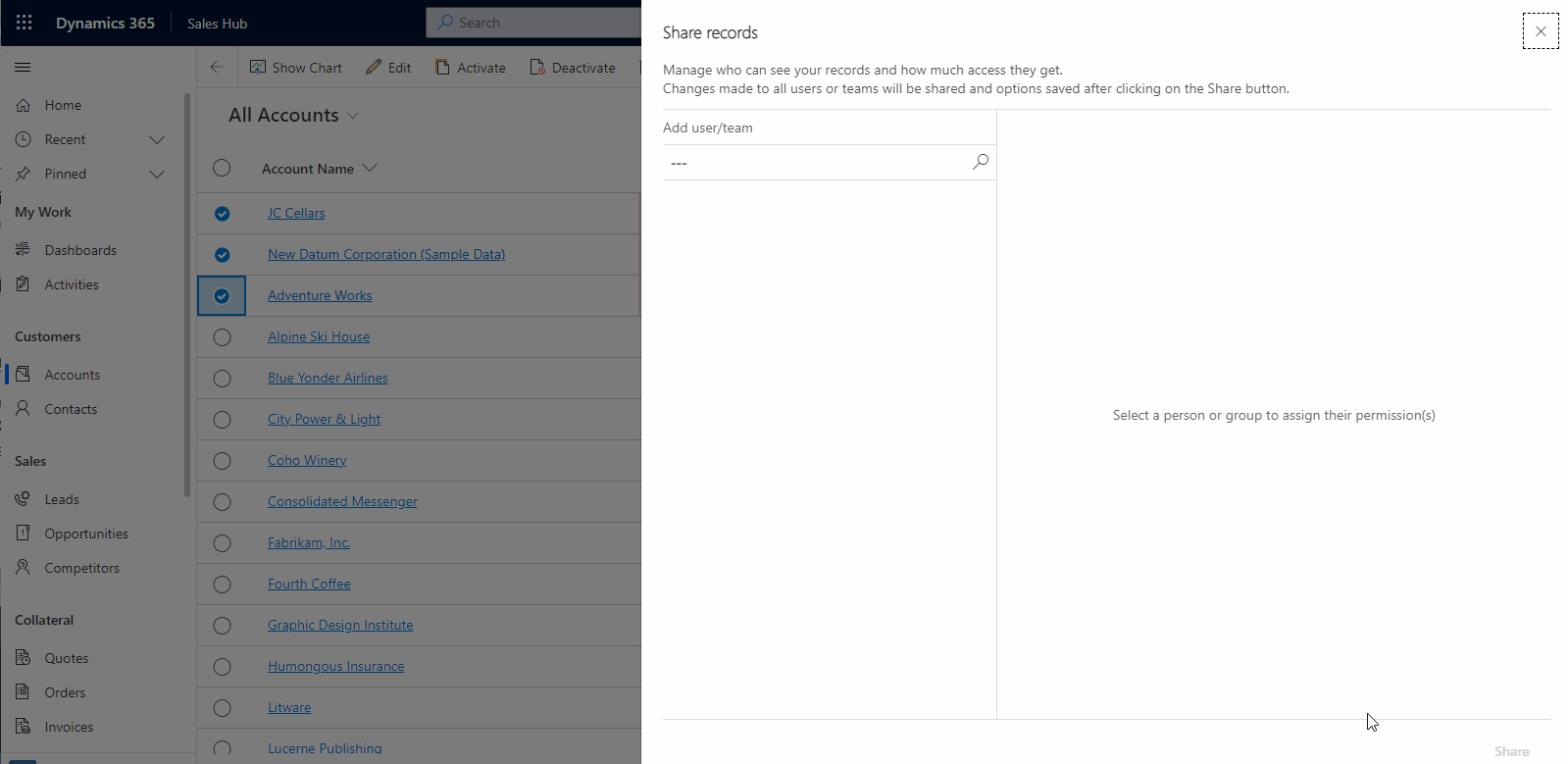 Users will experience a new and streamlined Unified Interface experience when sharing rows with other users and teams in a model-driven app. This provides a Web Content Accessibility Guidelines (WCAG) 2.1 accessible experience by using modern dialogs and controls.