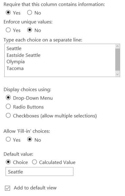 HEADS UP: We currently have a connector issue logged where the SharePoint default field value for choice lists is only recognized by PowerApps if it is the very first option in the list of choices on SharePoint. Because of this, if you want to use a default value for that SharePoint choice field within your PowerApp; make sure it’s at the top of the choice list. You can see this setting in the screen shot below. (in that case, we set this default because 99% of the end users will be lodging in the “Seattle” area). In addition to this note, I will sometimes enter “Select One” at the top of the choice list whenever I want my PowerApp to default to a blank value….then I’ll set a pre-submission data validation (like the OnChange one in this article) to trap that “Select One” value if left unchanged, and if I don’t want blanks in my data. (We hope to have this SP connector issue resolved very soon, but I wanted to be transparent on it so you’d know -smiles.)
