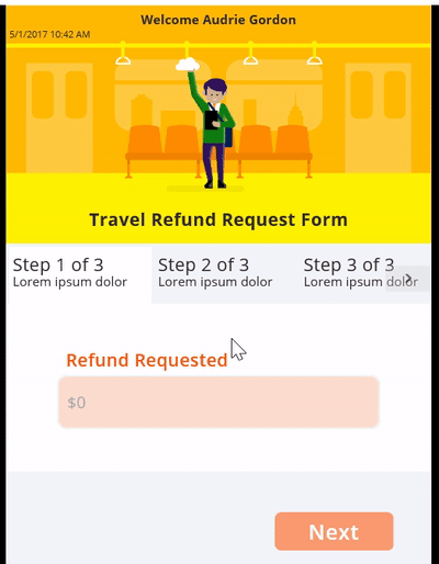 3. EVALUATE ERRORS ON CHANGE – In the animation above I also demonstrate the user experience for evaluation of errors on change (or on focus loss as some form designers refer to this). It is displayed based on a variable, plus a condition set in the ‘Visible’ property of the label containing the error text. However, it is not evaluated until the end user leaves the text input control. Let’s start with the variable first; I dynamically create a variable called VarRefund whenever the value changes in that control. I did this by setting an OnChange condition directly on the Text Input Control:
