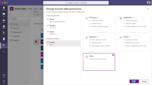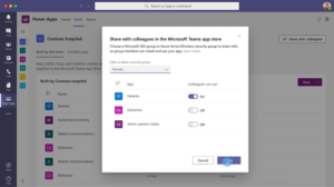 To support broad distribution apps, we’ve introduced two new pieces of UX that you can find within the Power Apps app within Teams: table permissions and the Share with colleagues button.