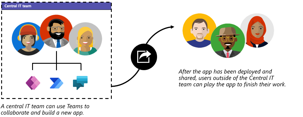 A common scenario is for a centralized team (e.g. Central IT or Central HR) to create a Teams team where they can collaborate and build a solution together. Within the team, they can chat with each other, share design files, and create all of the resources (apps, flows, and tables) necessary to solve a particular business need.